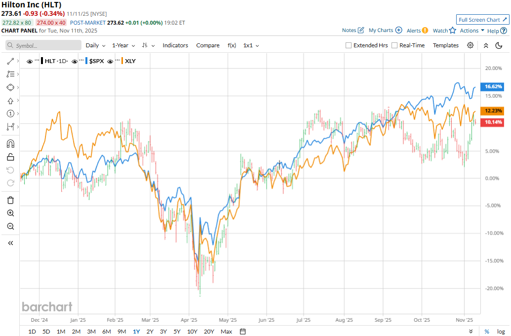 Narrowing the focus, Hilton has outpaced the sector-focused Consumer Discretionary Select Sector SPDR Fund’s (XLY) 6.8% uptick in 2025 and 9.2% gains over the past 52 weeks.