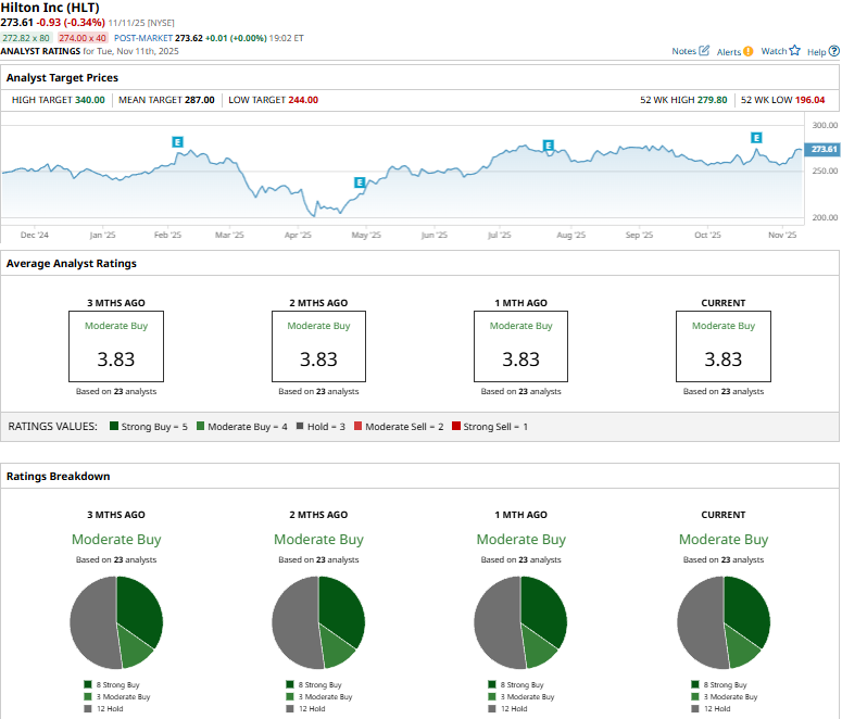 Hilton’s mean price target of $287 represents a modest 4.8% premium to current price levels. Meanwhile, the street-high target of $340 suggests a notable 24.3% upside potential.