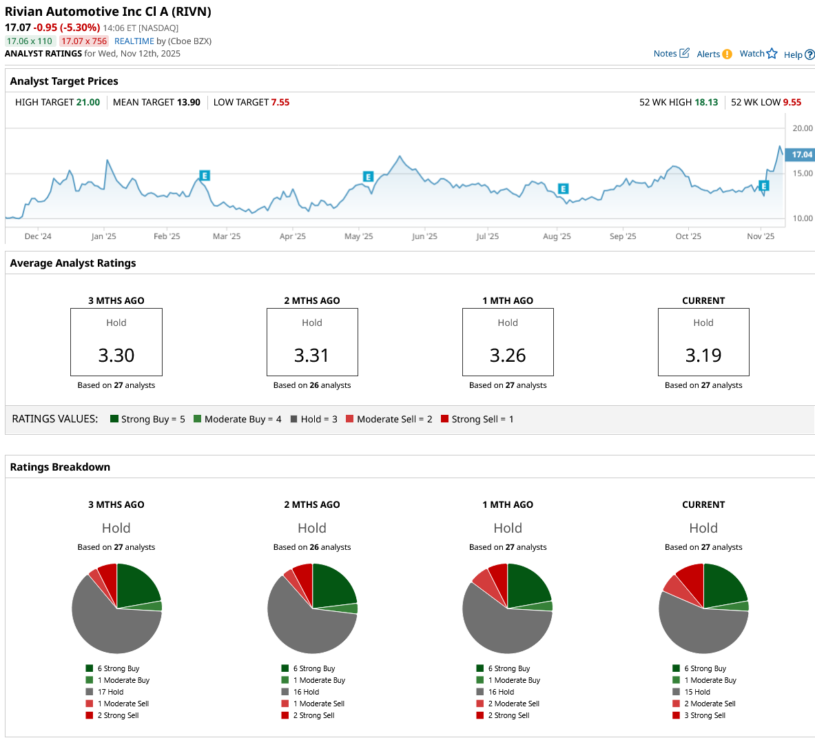 Analyst sentiment toward RIVN remains divided, reflecting both optimism and caution. The consensus rating stands at “Hold.” Among 27 analysts covering the stock, six have issued a “Strong Buy,” one has a “Moderate Buy,” 15 recommend “Hold,” two suggest “Moderate Sell,” and three assign a “Strong Sell.”