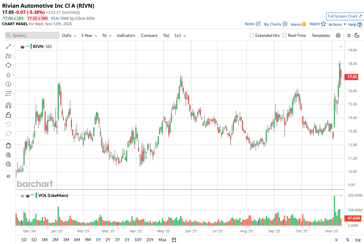 On Nov. 4, the EV maker released its third-quarter fiscal 2025 results, and the next day, its stock charged ahead by 23.4%. Rivian generated $1.56 billion in revenue, up 78.3% from last year and ahead of analysts’ forecasts of $1.46 billion.