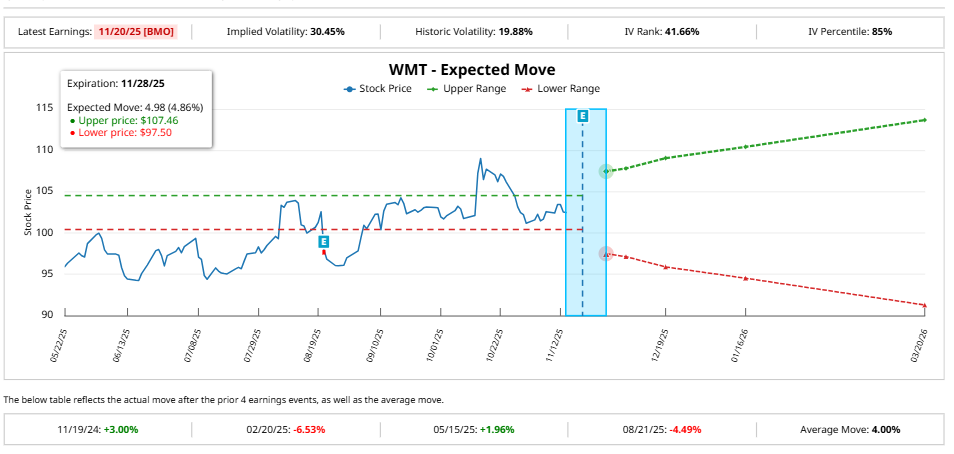 Notably, options markets are currently pricing in a 4.9% swing in either direction following the earnings release for contracts expiring Nov. 28, slightly larger than the average move of about 4% over the last four quarters. Historically, Walmart shares have fallen in two of the past four earnings reactions, reflecting the mixed sentiment heading into Thursday.