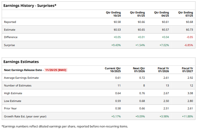 Analysts expect Walmart to report earnings of $0.61 per share for the third quarter, representing a 5.2% increase from the same period last year. The company has topped Wall Street expectations in three of the past four quarters, though its most recent results came in slightly below estimates, with a 6.9% miss.