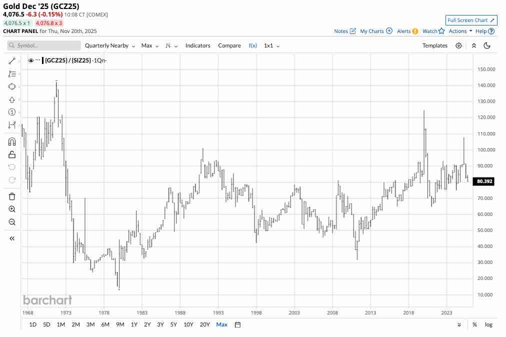 The long-term chart of the silver/gold ratio ({GCZ25}/{SIZ25}) shows that for nearly six decades, the ratio has been as high as 1:142 and was low as 1:14.24. In the 2000s, the range has been from 1:31.66 to 1:124.65. The midpoint of the range is around 78 ounces of silver value for each ounce of gold value. At $4,075 per ounce, a return to that average would put silver’s price at $52.24. However, silver’s volatility, gold’s bullish trajectory, and the pattern of lower highs in the silver/gold ratio suggest higher silver prices. A return to the ratio’s low in 2011 at 1.36.22 would put silver’s price at $112.50 with gold at $4,075 per ounce.