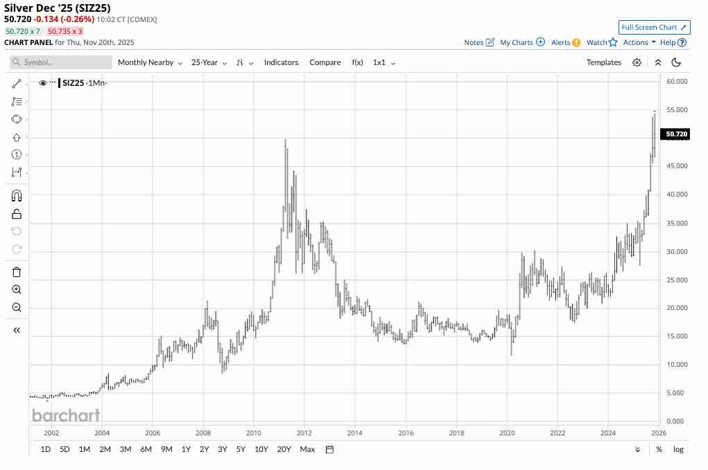 The monthly continuous COMEX silver futures chart highlights silver’s rise to $53.765 per ounce in October 2025, surpassing the 2011 $49.92 and the 1980 $50.36 peaks.