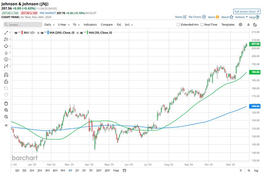 Johnson & Johnson’s shares have surged in 2025 thanks to stronger-than-expected financial performance, with Q3 (reported on Oct. 14) sales up 6.8% year-over-year and adjusted EPS rising 15.7% annually to $2.80. At the same time, strategic moves have also helped. J&J is spinning off its slower-growing orthopedics business to sharpen focus on higher-margin, faster-growing areas such as cardiovascular and MedTech, and strengthening its drug pipeline via acquisitions.