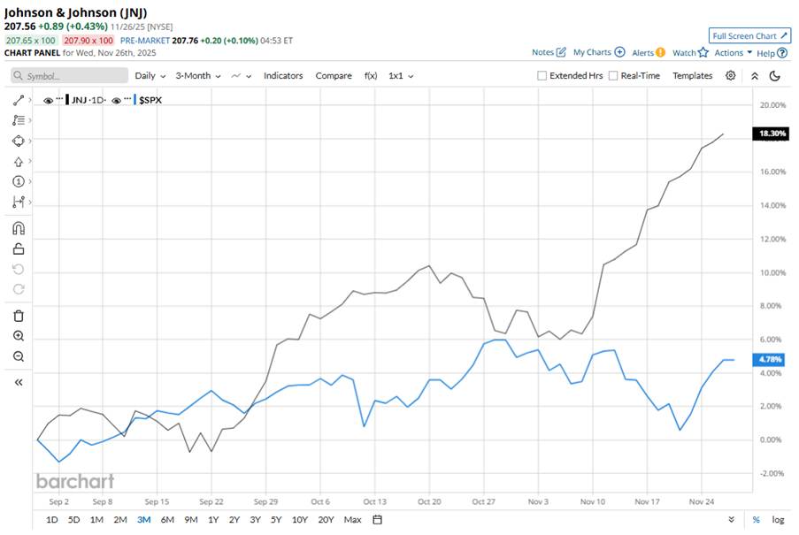 JNJ is down marginally from its 52-week high of $207.81, achieved on Nov. 26. Over the past three months, JNJ stock gained 17.6%, outperforming the S&P 500 Index’s ($SPX) 5.1% gains during the same time frame.