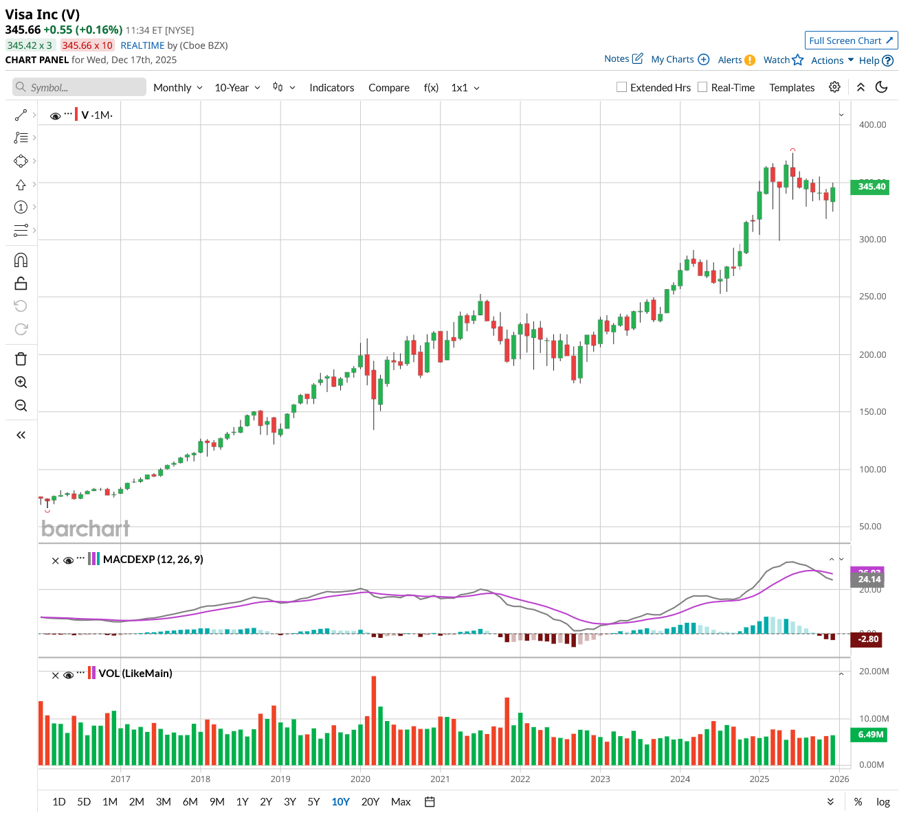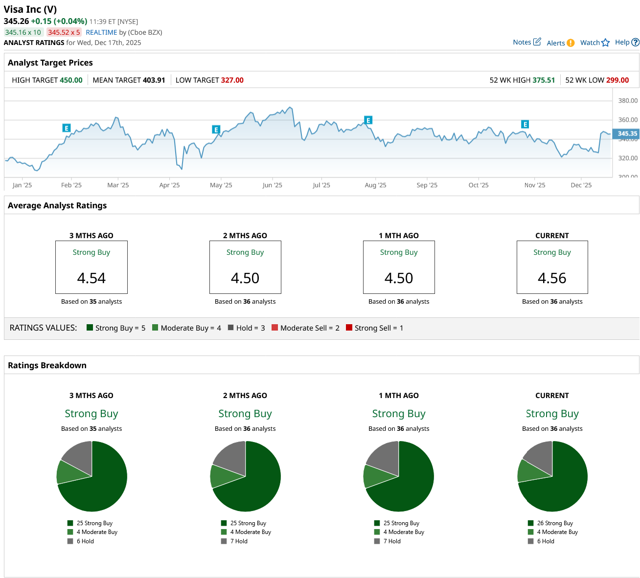 Out of the 36 analysts covering V stock, 26 recommend “Strong Buy,” four recommend “Moderate Buy,” and six recommend “Hold.” The average Visa stock price target is $404, above the current price of $345.