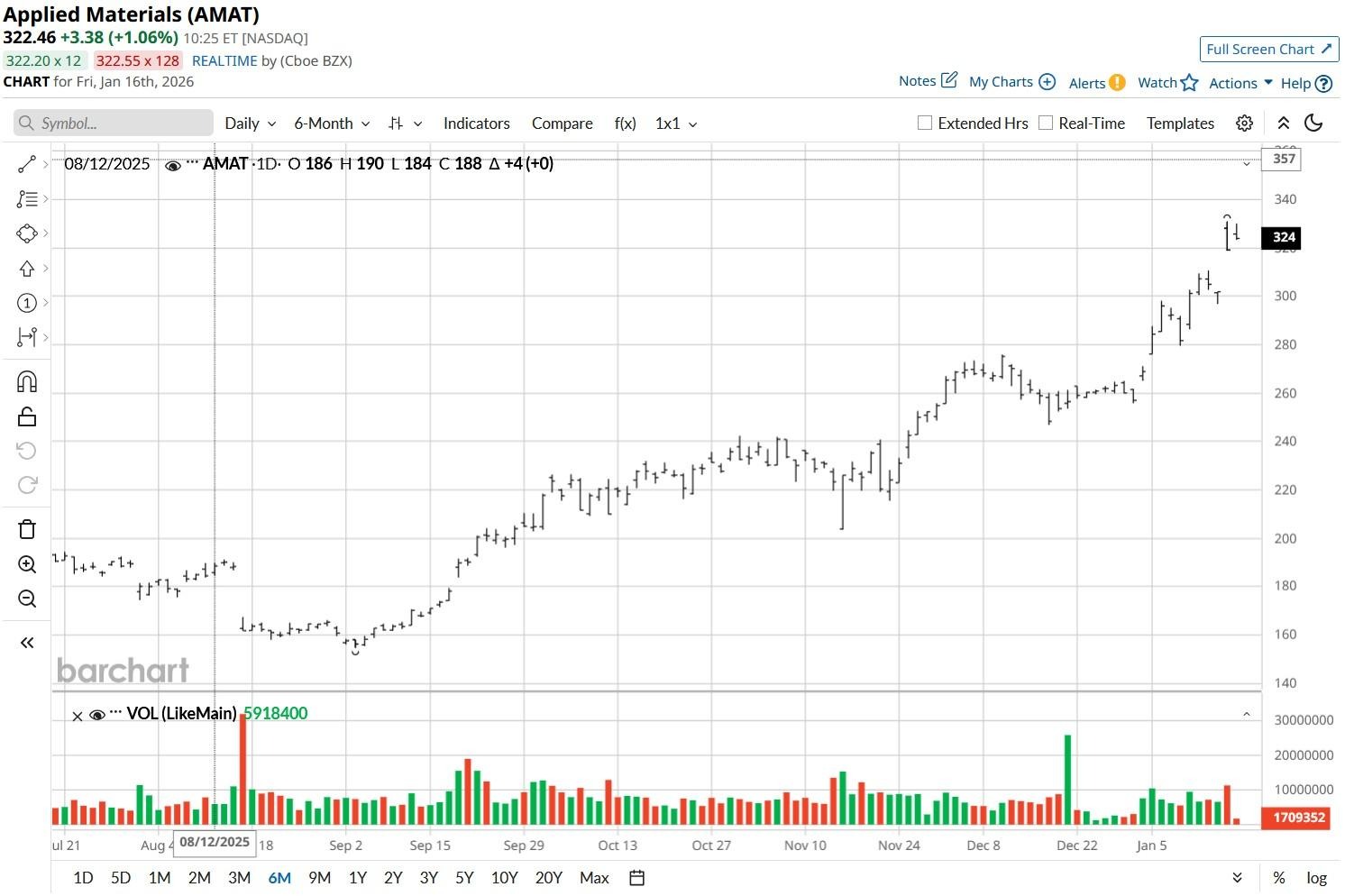 Applied Materials (AMAT) shares pushed higher to a record price of about $331 this week after peer Taiwan Semiconductor’s (TSM) record earnings sparked a sector-wide rally.