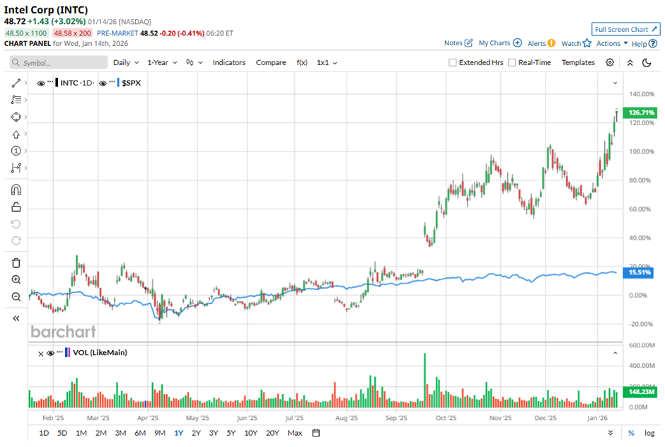 The momentum hasn’t slowed in 2026 either. In just the first few trading days of the new year, Intel’s stock is already up an impressive 31%, easily outpacing the broader market’s modest 1.02% year-to-date (YTD) rise, a clear sign that investor enthusiasm remains red-hot.