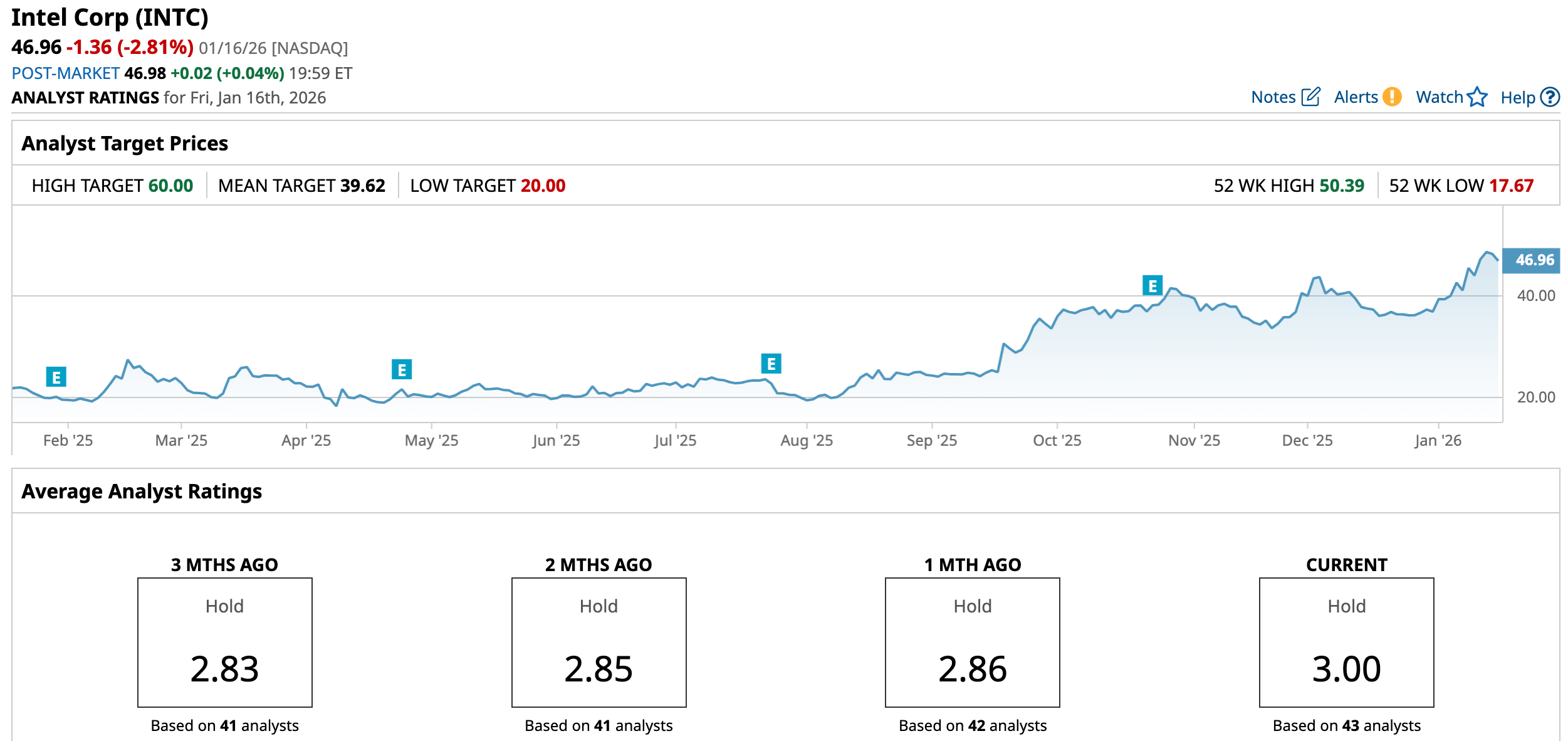 What makes this even more striking is that Intel has already rallied past the average price target of $39.62. Still, the most optimistic analyst sees room to run, with a Street-high target of $60, implying another 27.8% upside from here if the rally keeps going.