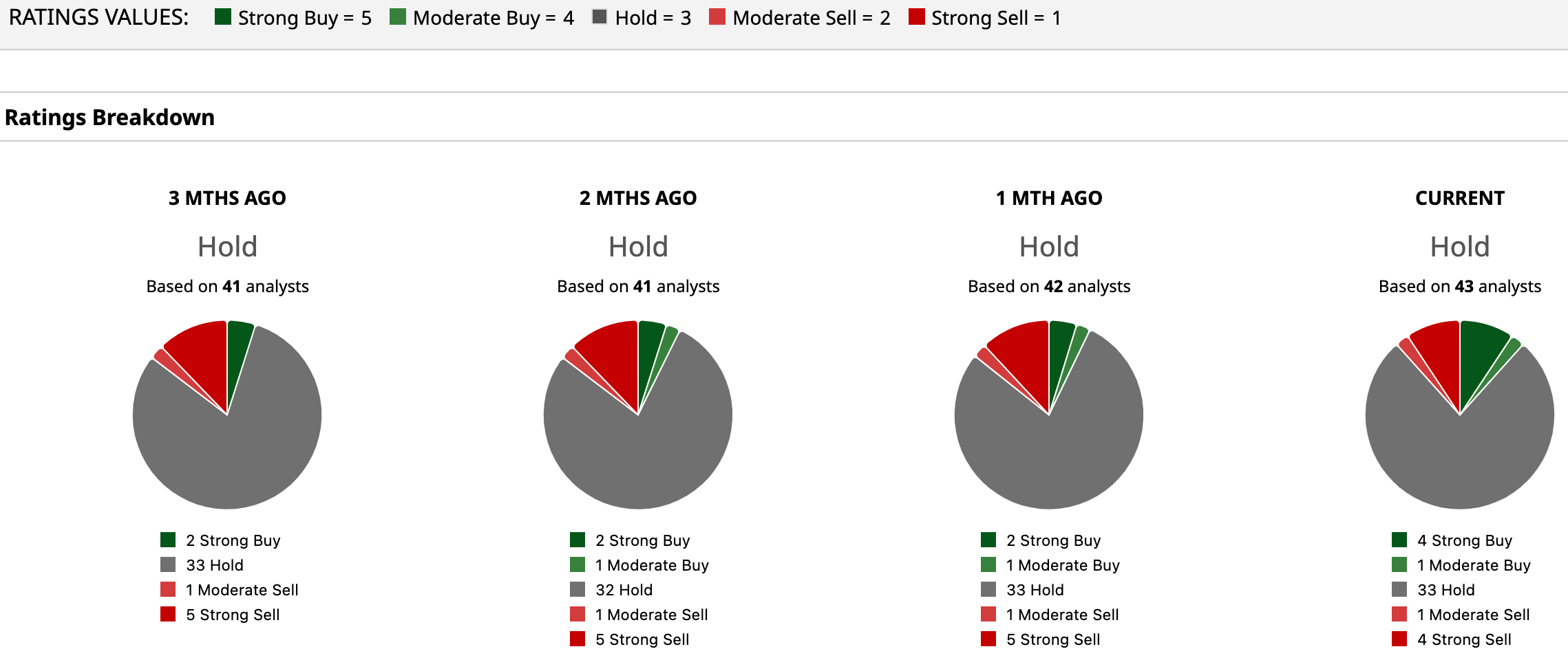 But despite Intel’s recent rally, Wall Street remains cautious overall. The stock currently carries a consensus “Hold” rating, reflecting a wait-and-see approach among analysts. Out of the 43 analysts covering Intel, only four rate it a “Strong Buy” and one calls it a “Moderate Buy,” while a dominant 33 analysts sit on the sidelines with a “Hold.” On the bearish end, one analyst has a “Moderate Sell” and four recommend a “Strong Sell.”