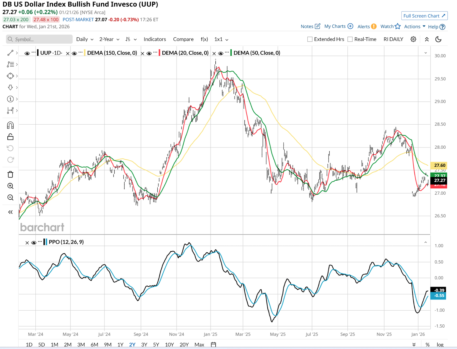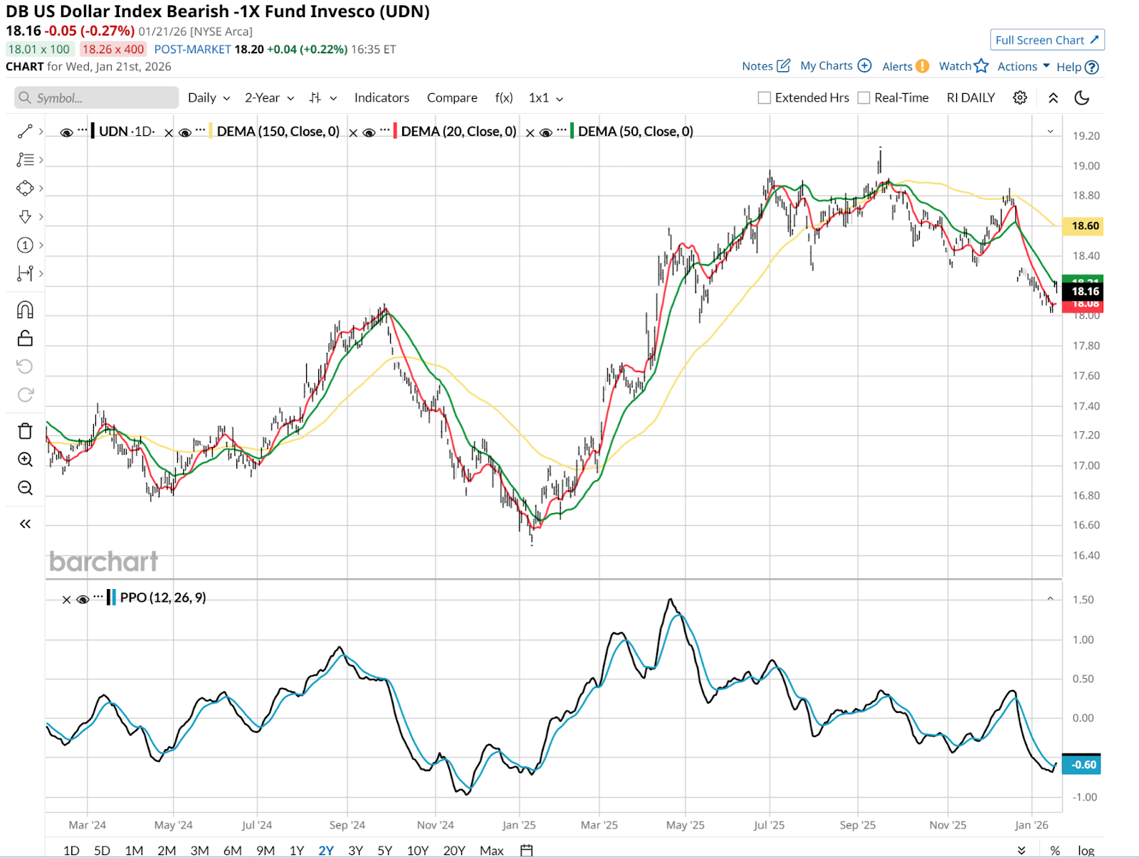 On Dec. 22, 2025, DXY dropped about a third of 1%. But UUP’s price fell by 3.7%. The distribution was the difference. And since the goal here is to use UUP, or its inverse ETF cousin Invesco DB US Dollar Index Bearish Fund (UDN) to try to profit from big moves in the dollar the rest of this year, let’s chart DXY, then turn back to the ETFs.