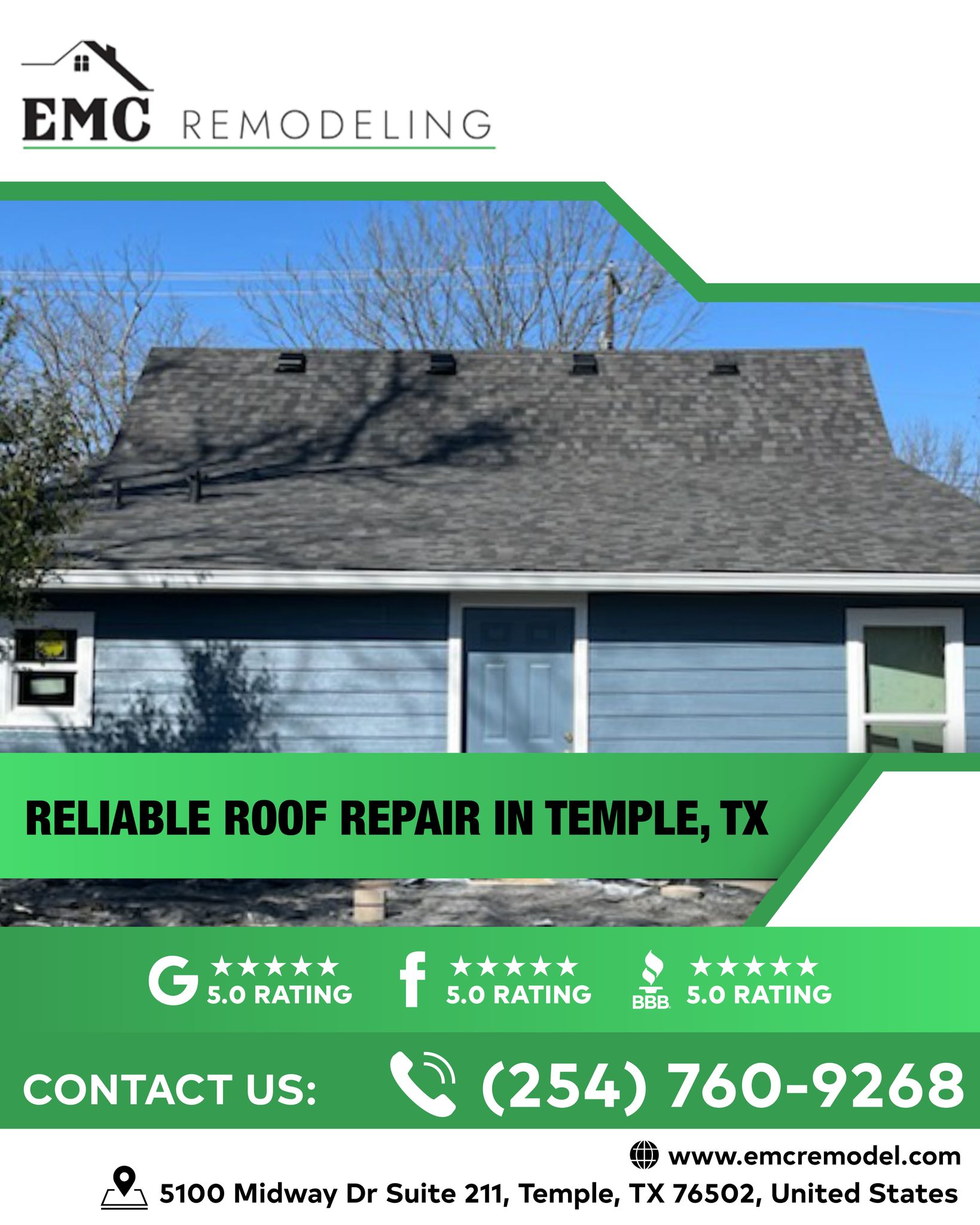 EMC Remodeling is a top-rated roof repair company based in Temple, Texas, offering comprehensive home improvement solutions across Central Texas. Specializing in roof repair, roof replacement, emergency services, and exterior remodeling, the company is known for its transparency, quality workmanship, and commitment to customer satisfaction. Serving both residential and multi-family properties, EMC Remodeling is fully licensed and insured, delivering tailored solutions for long-lasting home performance.