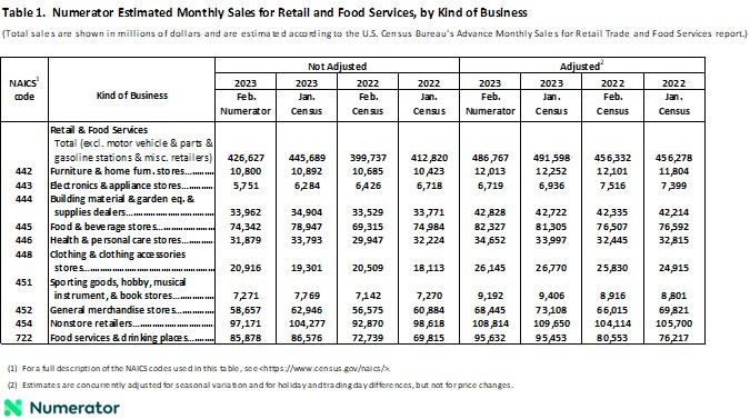 CHICAGO, March 14, 2023 (GLOBE NEWSWIRE) -- According to the Numerator Retail Sales Report, projected retail sales (excluding motor vehicle & parts, gasoline, and miscellaneous retailers) were $487 billion in February 2023, down 1.0% from the previous month and up 6.7% compared with February 2022 on a seasonally adjusted basis.