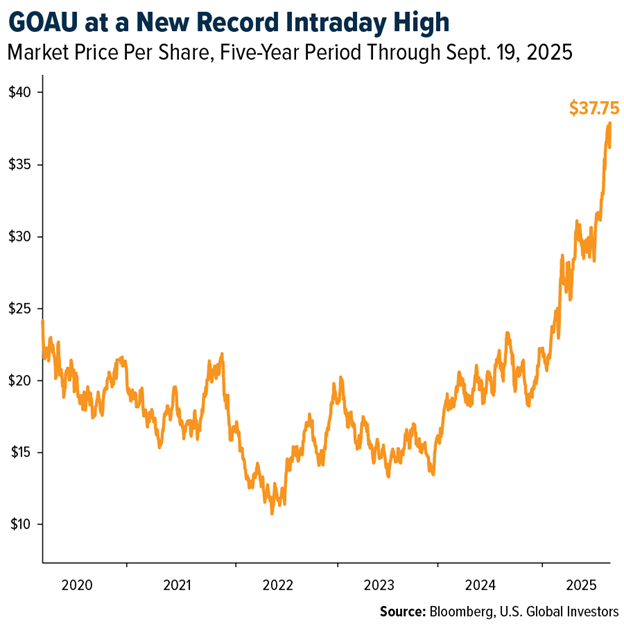 “I’m pleased to share that GOAU hit a new record intraday high of $37.75 per share on Friday, September 19, approximately double the price since the start of 2025,” says Mr. Holmes. “Investors appear to be betting that the Federal Reserve is ready to start lowering interest rates, which historically has favored gold prices.”