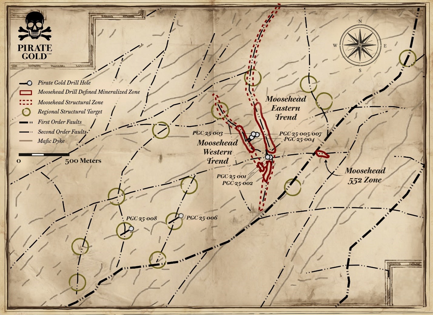 "The initial focus of our 50,000m drilling program has been to explore both within and around the immediate vicinity of the Moosehead Zone looking for other similar gold bearing structures. Our exploration ethos has been that Moosehead shouldn't be a singular high-grade structure and that it fits into a larger mineral system as seen in other orogenic gold deposits. Our acquisition of the Stony Lake project south of Moosehead in October includes historical drilling results up to *1.88g/t Au over 27.35m and 1.52g/t over 31.75m located just 5 km south of the Moosehead fault structure which indicates there is much more to learn about the gold mineralization in this part of the Treasure Island Project," said Greg Matheson, VP Exploration of Pirate Gold.