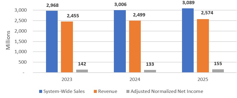 Mike Walsh, President and CEO of LFL commented, "In 2025, our teams delivered the outstanding value and experience Canadians expect, while maintaining gross margin and cost discipline. These efforts drove strong full-year results. System-wide sales grew 2.8% to $3.1 billion, normalized adjusted diluted EPS increased 16.5%, and we continued to generate robust cash flow. Reflecting these results, we increased our quarterly dividend by 20% and ended the year with a rock-solid balance sheet supported by $603 million in unrestricted liquidity."