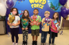 Five kids with crafts in front of "Word Force" banner Woman in Truist t-shirt