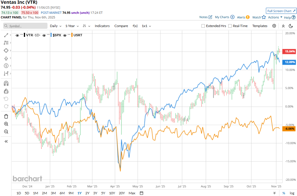 Narrowing the focus, Ventas has also outpaced the industry-focused iShares Core U.S. REIT ETF’s (USRT) marginal 35 bps uptick in 2025 and 3.7% decline over the past 52 weeks.