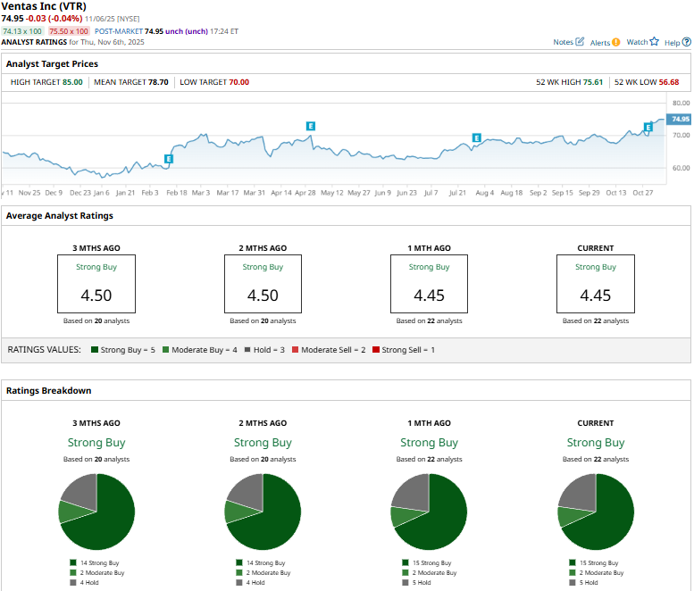 On Oct. 31, Cantor Fitzgerald analyst Richard Anderson reiterated an “Overweight” rating on VTR and raised the price target from $77 to $85, suggesting a 13.4% upside potential.