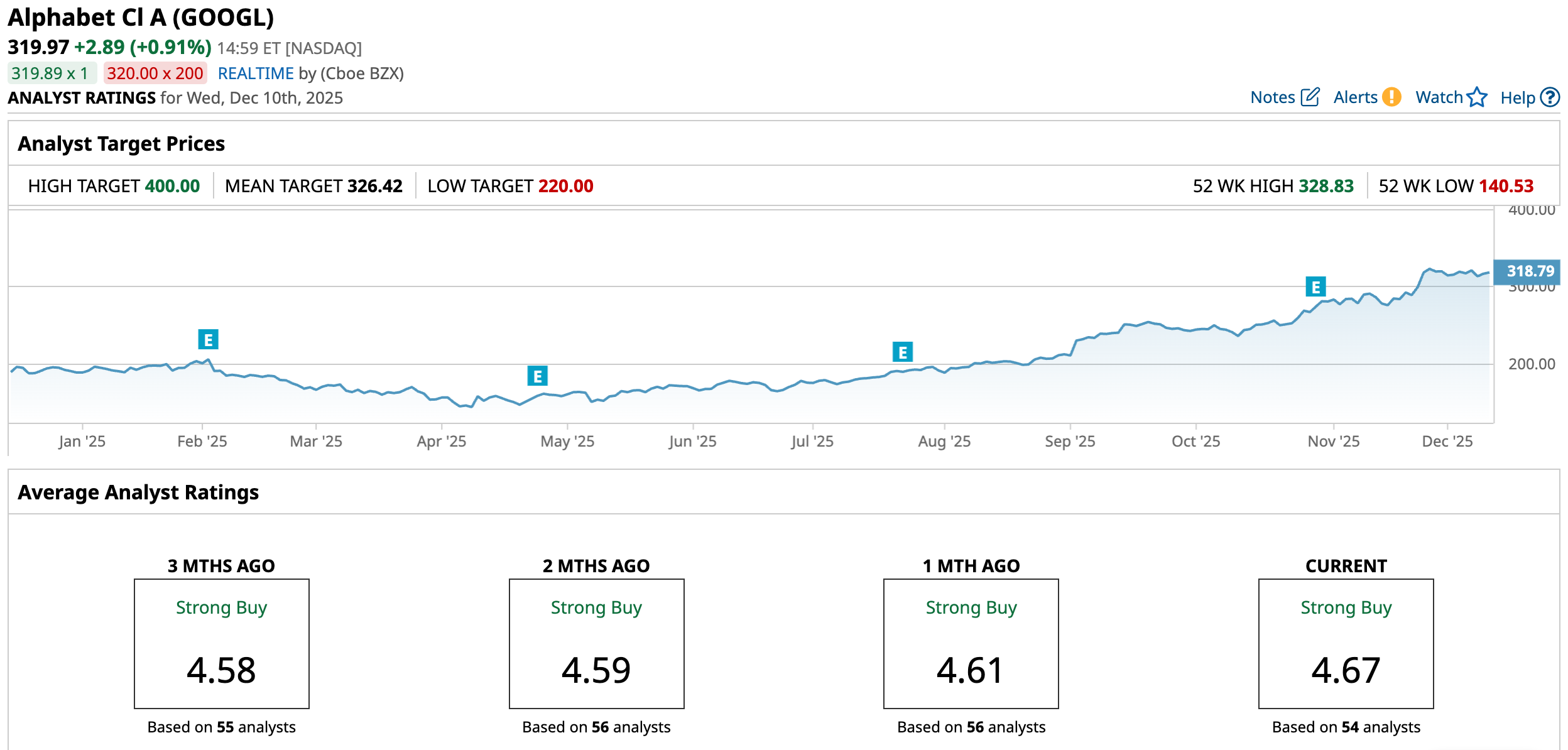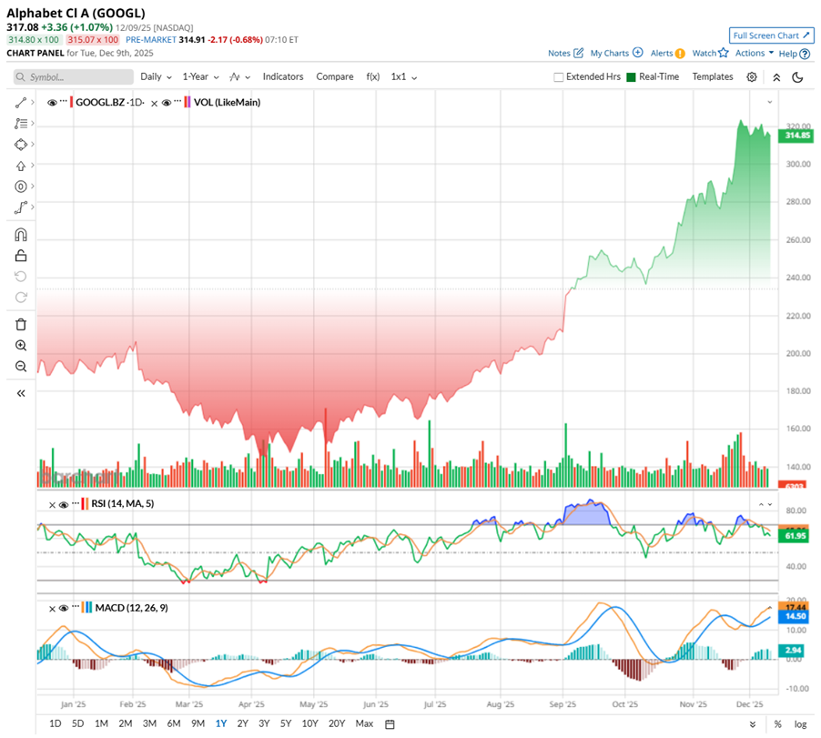 Zooming out only amplifies the scale of the climb. By comparison, the S&P 500 Index ($SPX), rising a respectable 16.48% in 2025, has been left far behind as Alphabet’s ascent continues at a different cadence altogether. The stock recently marked a 52-week high at $328.83, and its current 3.4% dip from that peak is less like a weakness and more like a consolidation phase.