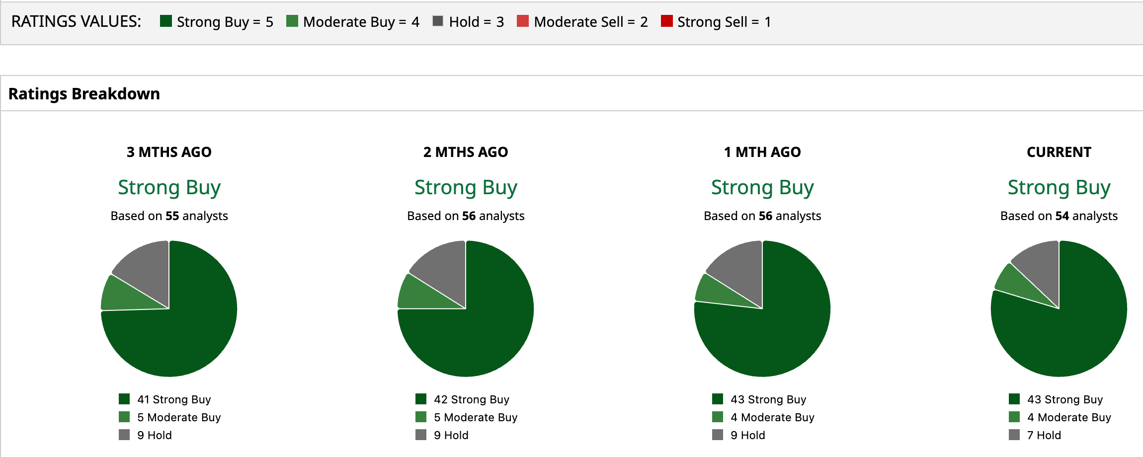 Analysts monitoring GOOGL are optimistic, with consensus leaning heavily toward a “Strong Buy.” Out of 54 analysts, 43 advise a “Strong Buy,” four recommend a “Moderate Buy,” and seven are cautious with a “Hold” rating.