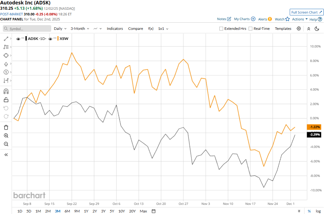 ADSK touched its three-year high of $329.09 on Sept. 8 and is currently trading 5.7% below that peak. Meanwhile, its stock prices have declined 2.8% over the past three months, slightly underperforming the SPDR S&P Software & Services ETF’s (XSW1.6% dip during the same time frame.