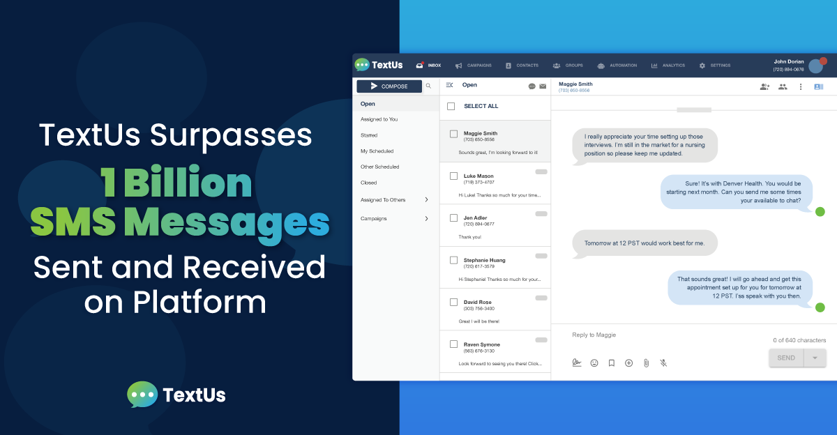 Denver, Colorado, April 18, 2023 (GLOBE NEWSWIRE) -- TextUs, the leading conversational texting platform that enables organizations to have engaging real-time conversations with prospects, candidates, employees and customers has recently surpassed one billion messages sent and received on its platform.